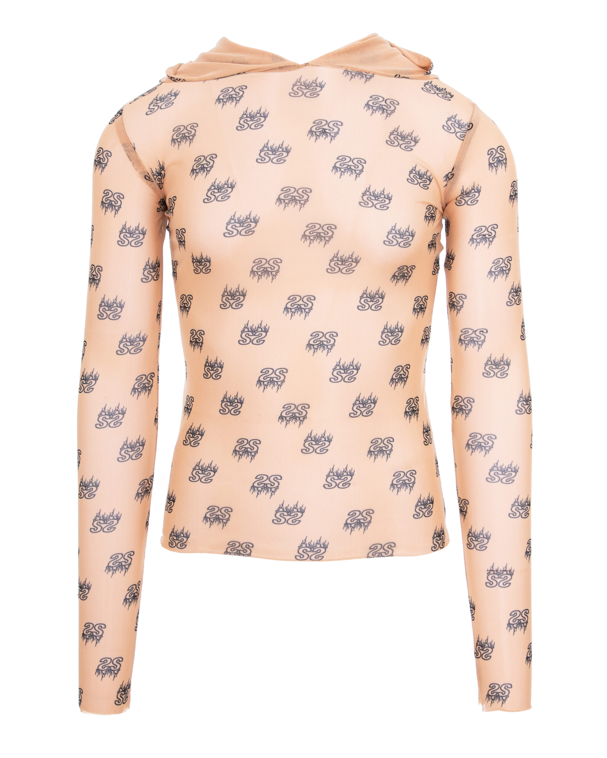 Product Details Tulle material Beige/black color High neck Long sleeves Hood Printed logo pattern Bodycon fit Made in Romania Dry cleaning recommended Material: 70% polyamide, 30% elastane